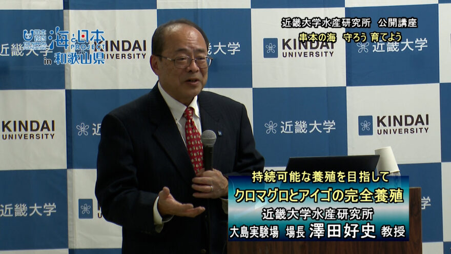 第2部は、近畿大学水産研究所大島実験場の澤田好史場長が持続可能な養殖を目指してと題して講演し養殖の現状や最新技術などについて説明したほか、海の環境を守って行くためには一般の人達も積極的に参加する必要があると話しました。