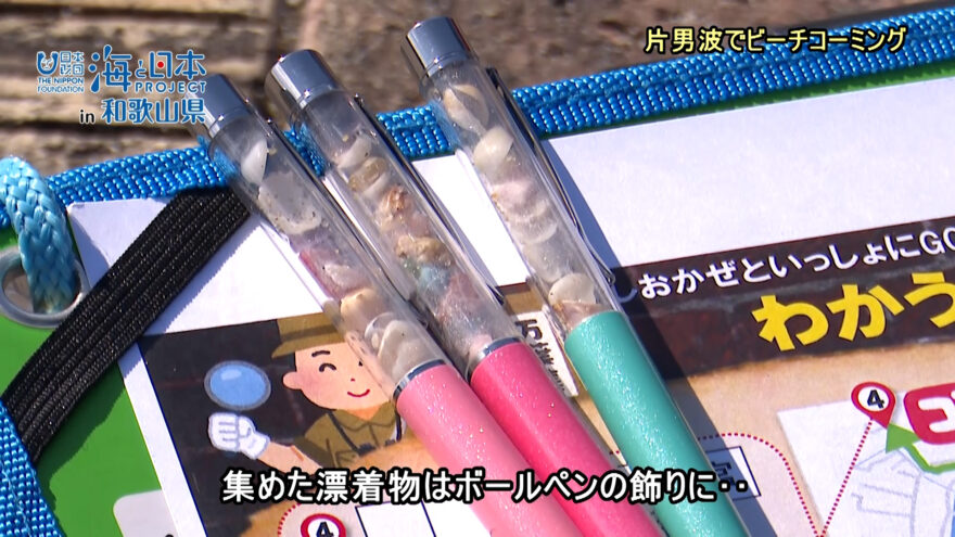 集めた漂着物はボールペンに入れて、飾りに…