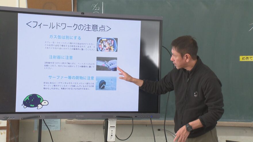 浜辺で回収したプラスチックごみに記された言語などから海洋ごみは国内だけの問題ではないことを教わった児童らは、海水浴場でごみ拾いをするなどして海洋ごみ問題の現状を学びました。