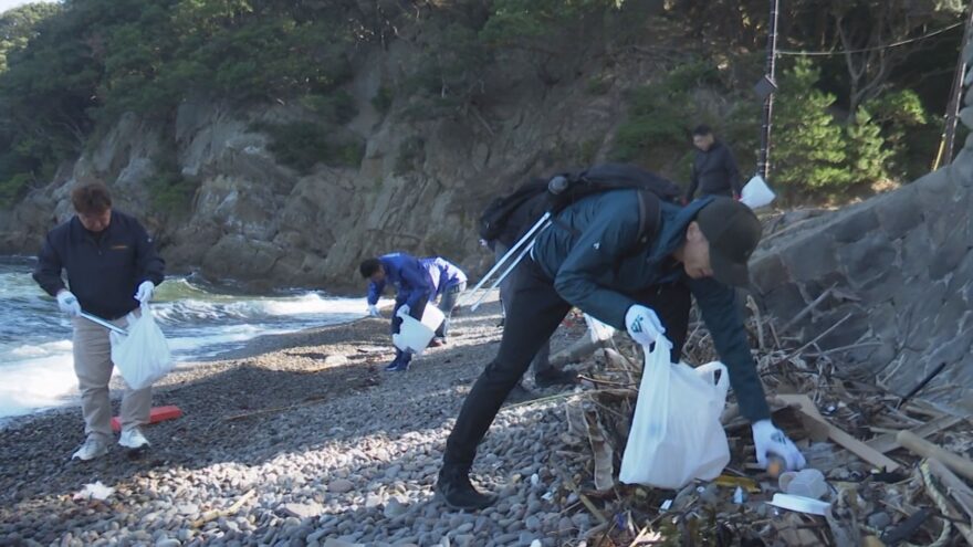 この取り組みには、関連会社を合わせておよそ60人が参加し、海流や風、波などによって島の海岸に打ち上げられたペットボトルなどのプラスチックごみや空き缶などを拾い集めていきました。